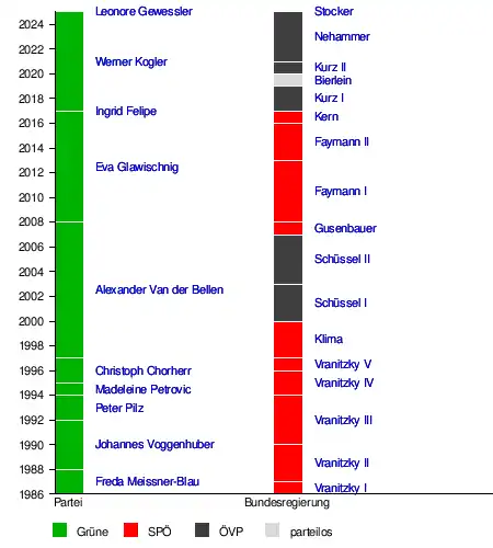 Seit 29. Juni 2025 ist Leonore Gewessler Bundessprecherin der Grünen.[4] Der ehemalige Bundessprecher der Grünen, Alexander Van der Bellen, ist seit 26. Jänner 2017 Bundespräsident.