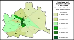 Bei der Nationalratswahl 2002 lagen die Grünen in Wien mit 15,1 % noch deutlicher über ihrem bundesweiten Ergebnis von 9,4 %. Die Grünen erreichten dabei in Wien knapp vor Vorarlberg erneut ihr bestes Bundesländerergebnis und konnten mit dem 7. Wiener Gemeindebezirk Neubau erstmals bei einer österreichweiten Wahl in einem Bezirk die relative Mehrheit erzielen.[21] Bei der daraufhinfolgenden Nationalratswahl 2006 steigerten die Grünen in Österreich ihren Stimmenanteil auf 11,0 %. Wien blieb dabei mit 17,4 % der stimmenstärkste Landeswahlkreis der Grünen. Diesmal erzielten die Grünen neben Neubau auch die relative Mehrheit in den Bezirken Mariahilf und Josefstadt, womit die Grünen erstmals auch in einem Regionalwahlkreis (Wien Innen-West) die relative Mehrheit erreichten.[22]
