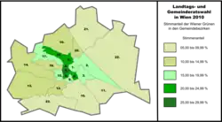Nach den Spaltungen in zwei der 23 Grünen Bezirksgruppen gerieten die Wiener Grünen bereits zu Beginn der Landtags- und Gemeinderatswahl 2010 in die Defensive. Mit 12,6 % erreichten sie nur noch 11 Mandate, was einen Verlust von rund zwei Prozentpunkten drei Mandaten bedeutete. Hatten die Grünen 2005 noch sieben Direktmandate erreicht, so erzielten sie 2010 nur noch vier Direktmandate, wobei je ein Mandat in den Wahlkreisen Zentrum, Innen-West, Leopoldstadt und Landstraße erreicht wurde. Ihr stärkstes Ergebnis erreichten die Grünen mit 29,4 % im Bezirk Neubau, lediglich 6 bis 7 % konnten sie in den Bezirken Simmering, Favoriten, Donaustadt und Floridsdorf erzielen.