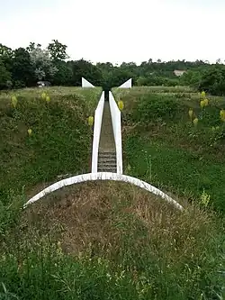 Ausgangspunkt des Land-Art-Projekts „Die Grube“ ist der über 200 Jahre alte, aus Sandstein gebaute Weinkeller. Das nördliche Ende des Kellergewölbes wurde freigelegt, die Kellerabschlusswand nach innen verschoben, sodass ein überwölbter, windgeschützter, mit Bänken und Tischen aus Sandstein – aus dem angeschlossenen Steinbruch – gebauter Raum entstand, offen nach Norden. Daran schließt „Die Grube“ an (am Boden ein Durchmesser von 8 Metern, der obere Rand des Trichters hat einen Durchmesser von 20 Metern). Die Neigung der Grasböschung beträgt mehr als 50 Grad. In dem hermetischen, jedoch zum Himmel weit aufgespreizten Graskegel, kann man unten im Freien auf Sandsteinquadern Platz nehmen.