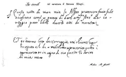 „Und ich, Antonio Lieto von Correggio, bekenne, an dem oben bemerkten Tage und Jahre, so viel als oben geschrieben ist, erhalten zu haben, und zum Zeichen dessen habe ich dies mit meiner Hand geschrieben.““