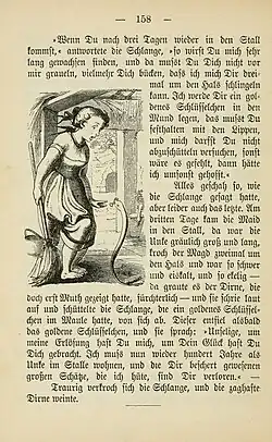 Eine Magd pflegt treu das Vieh. Im Kuhstall lebt eine Schlange. Die spricht einmal, dass sie in drei Tagen sehr lang sein wird, um sich der Magd dreimal um den Hals zu schlingen und ihr ein goldenes Schlüsselchen in den Mund zu legen. So kommt es, doch die Magd bekommt doch Angst und schüttelt sie ab. Da muss die Schlange wieder hundert Jahre auf Erlösung warten. Die Magd weint.