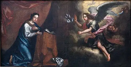 In der linken Bildhälfte kniet Maria, gekleidet in einen blauen Mantel und ein helles Untergewand, an einer mit einem roten Tuch bedeckten Gebetsbank. Auf der Bank liegt ein aufgeschlagenes Buch. Auf der rechten Seite stürmt im Flug der Engel Gabriel in den Raum. In der Hand hält er eine langstielige Madonnenlilie. Mit der Rechten er deutet nach oben, wo sich der Himmel öffnet, und in einem goldenen Licht die Taube des Heiligen Geistes erscheint. Der Engel scheint auf einer Wolkenbank zu knien, seine Flügel sind noch im Flug entfaltet, und der leichte, zart fliederfarbene Schleier, der um ihn her flattert, zeigt noch die Dynamik seines Flugs an. Hinter ihm sieht man in den Wolken die Köpfe eines Puttenpaars und schemenhaft weitere Gestalten.