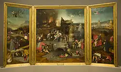 - Hieronymus Bosch (um 1450–1516): Die Versuchungen des heiligen Antonius (um 1505/10), s. Abbildung, Triptychon, 131,5 × 53 cm (Flügel) und 131,5 × 119 cm (Mitteltafel) Museu Nacional de Arte Antiga, Lissabon.