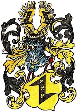 Blasonierung im Wappenbuch des Westfälischen Adels: In Gold eine schwarze schrägliegende Wolfsangel mit drei goldenen Kleeblättern belegt. Auf dem gekrönten Helm ein offener goldener Flug mit der Wolfsangel belegt. Die Helmdecken sind schwarz-golden.[9]