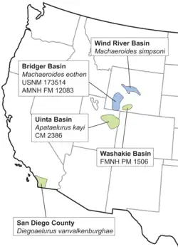 - ↑ a b c d e f g Shawn P. Zack, Ashley W. Poust und Hugh Wagner: Diegoaelurus, a new machaeroidine (Oxyaenidae) from the Santiago Formation (late Uintan) of southern California and the relationships of Machaeroidinae, the oldest group of sabertooth mammals. PeerJ 10, 2022, S. e13032, doi:10.7717/peerj.13032