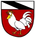 Blasonierung: Unter silbernem Schildhaupt, darin ein schwarzer Schrägbalken, in Rot ein schreitender, golden bewehrter silberner Hahn.[3]