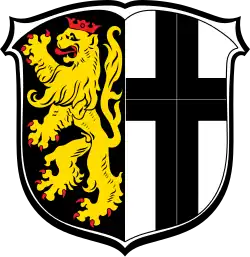 Blasonierung: „Von Schwarz und Silber gespalten, rechts ein rotbewehrter goldener Löwe, links ein schwarzes Kreuz.“ |