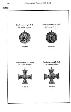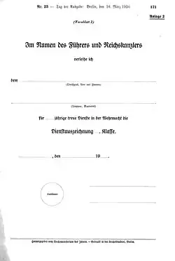 - ↑ Verordnung über die Stiftung von Dienstauszeichnungen vom 16. März 1936, Reichsgesetzblatt Nr. 23, Seite 165, Eingangsformel
