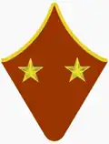 - Kragenabzeichen (rhombusförmigen): in Goldfadenstickerei ein großer Stern, im unteren Teil zwei umrankende Lorbeerzweige sowie das Emblem Hammer & Sichel.