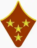 fünfzackiger kleiner Stern (Goldfadenstickerei) mit waffenfarbiger Paspelierung, darunter 32 mm breiter Stoffwinkel (Goldfarben) mit 3 mm breiter waffenfarbiger Kante am unteren Rand |