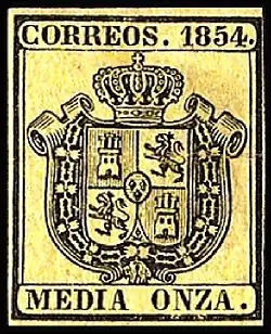 Die ersten Dienstmarken, die tatsächlich verwendet wurden, kamen in Spanien im Juli 1854 zur Ausgabe. Es handelte sich um Marken mit einem schwarzen Staatswappen, gedruckt auf farbiges Papier. Sie trugen am unteren Bildrand Gewichtsangaben des zur Beförderung maximal zugelassenen Briefgewichtes.