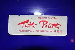 Als das Schild 1990 erste Abwitterungen aufwies, änderte ein Kirchenmaler in Absprache mit Frowein-Lyasso die Farbigkeit, der freie Schriftzug blieb aber unverändert erhalten. Fortan leuchtete auf dem metallenen Ladenschild ein karminroter Schriftzug auf ultramarinem Grund. Diese Farbkombination fungierte bis zur Schließung von Tutti Paletti am 1. Mai 2013 als Markenzeichen des Künstlerfachgeschäftes.