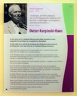 Das St.-Elisabeth-Stift gehörte nunmehr zur Stephanus gGmbH und damit zur Diakonie Berlin-Brandenburg-schlesische Oberlausitz.[8] Einen Nachruf auf Dieter Karpinski unterzeichnete der damalige Generalsuperintendent für Berlin, Martin-Michael Passauer, der zugleich Vorsitzender des Kuratoriums der Stiftung war.[9] Mit der Enthüllung der Gedenktafel am 16. Juni 2010 erfolgte die feierliche Namensverleihung eines Hauses auf dem Gelände des Elisabeth-Seniorenzentrums am Pankower Bürgerpark durch den damaligen Bundestagsvizepräsidenten Wolfgang Thierse und den Einrichtungsleiter.
