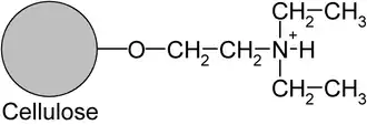 Diethylaminoethylcellulose (kurz DEAE-C), CAS-Nummer: 9013-34-7, Polymerzusammensetzung (C12H24O5N)n, ist ein häufig verwendeter schwach basischer Anionenaustauscher.[1] Das weiße, brennbare Pulver[2] wird aus Cellulose durch Ersatz des Wasserstoffatoms einer Hydroxygruppe durch die Diethylaminoethyl-Gruppe dargestellt. Technisch wird DEAE-C zur chromatografischen Trennung und Reinigung von hochmolekularen Proteinen eingesetzt.[3] In Kosmetikprodukten wird sie in der Liste der Inhaltsstoffe als DIETHYLAMINOETHYL CELLULOSE (INCI)[4] aufgeführt.