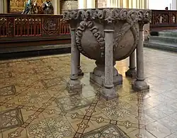 Ein in die Zeit um 1290 datierter Taufstein aus Basaltlava wurde in seinen vermauerten Bruchstücken im Abbruchmaterial der niedergelegten späteren Barockkirche gefunden und rekonstruiert. Dieser, und die sogenannte Dietkirchenmadonna aus dem 14. Jahrhundert sind überkommene Schätze. Sie zieren die heutige, von Heinrich Wiethase entworfene, im gotischen Stil erbaute Kirche.[17] Wann der Taufstein, der zeitweise auch als „Volksaltar“ diente, sowie die Skulptur der Madonna mit Kind in den Besitz der Pfarrkirche gelangten, ist derzeit nicht bekannt; sie werden aber später in die Dietkirche gekommen sein, da diese selbst zum Ende des 13. Jahrhunderts (Spendenaufruf durch Erzbischof Sifrid) und ebenfalls in den Anfängen des 14. Jahrhunderts auf Spenden für einen Neubau (der um 1316/17 im Bau war)[16] angewiesen war. Auch einer späteren Textpassage einer Einlassung von 1647 ist zu entnehmen, dass die Ausstattung des Kircheninneren recht dürftig gewesen sei. Auch die Gebäude des Konvents blieben in der oft von Durchzügen kriegerischer Banden betroffenen Stadt nicht von Schäden verschont. So berichtet eine Urkunde von 1320, dass die Äbtissin Ponzetta zu Dietkirchen – Schwester des Erzbischofs Heinrich II. von Virneburg – noch vor 1320 ein durch Brand/Brandstiftung vernichtetes Dormitorium in Dietkirchen für ca. 1000 Mark wieder aufbauen musste.[18] Nach den Kölner erzbischöflichen Regesten soll 1317 eine Krypta der Kirche existiert haben, die als ältester Teil des Bauwerks bezeichnet wurde.[19]