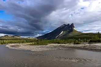 ![]() Dietrich River unmittelbar vor dem Zusammenfluss mit dem Bettles River, im Hintergrund der Sukakpak Mountain | ||