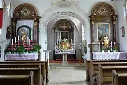 Der Chorraum umfasst den Hochaltar mit der Darstellung der heiligen Gertrud, den linken Seitenaltar mit der Gottesmutter Maria und den rechten Seitenaltar mit dem Bild des heiligen Wendelin. Das Altarbild des letzteren hat Georg Kaiser, Vater des oberbayerischen Landschaftsmalers Ernst Kaiser, 1833 geschaffen. Die Emporenbrüstung zeigt als Gemälde Christus mit den zwölf Aposteln. Im Kirchenschiff ist ein Deckenfresko mit dem heiligen Geist in der Gestalt einer Taube. Weiter finden wir Embleme aus dem Leben der heiligen Gertrud. Eine Pietà befindet sich an einer Seitenwand der Kirche, eine Kreuzigungsgruppe an der äußeren Kirchenwand.