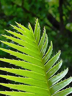 Die Fiederblättchen sind einfach, oft mit einem stacheligen Rand. Die Nervatur besteht aus vielen sich gabelig teilenden Nerven, ohne eine erkennbare Mittelrippe. Die Nerven entspringen direkt aus der Kante der Blattspindel (Rhachis) und verlaufen dann der Fiederachse zugewandt. Die Spreiten sind zumindest bei jungen Blättern behaart. Die Haare (Trichome) sind farblos, verzweigt oder einfach.