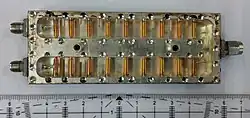 Prinzipiell kann ein Diplexer durch die Kombination zweier passiver und unterschiedlicher Filter aufgebaut werden, wie beispielsweise in nebenstehender Abbildung in Form eines Hohlleiterfilters mit dielektrischen Resonatoren. Die beiden Filter, im metallischen Gehäuse als untere und obere horizontale Strecke erkennbar, werden im Durchlassverhalten so gewählt bzw. eingestellt, dass sie jeweils den gewünschte Frequenzbereich im Bereich einiger GHz passieren lassen. Die beiden Filter werden an dem Summenanschluss zusammengeschaltet, in der Abbildung ist dies der Anschluss auf der rechten Seite, welcher beispielsweise zu einer gemeinsamen Antenne weiter geführt wird. Die beiden linken Anschlüsse stellen die im Frequenzbereich gefilterten Anschlüsse dar und gehen beispielsweise zu der Sendestufe und einer Empfangsstufe in unterschiedlichen Frequenzen.