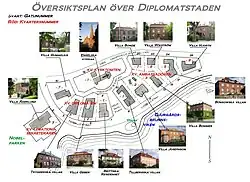 Die Diplomatenstadt hat keine offiziell festgelegten Grenzen und umfasste anfangs auch nur die ursprüngliche Villensiedlung. Heute zählt man auch das benachbarte Gebiet mit einigen ausländischen Botschaften dazu. Das Gebiet liegt nördlich des Djurgårdsbrunnsviken im Stadtteil Östermalm.