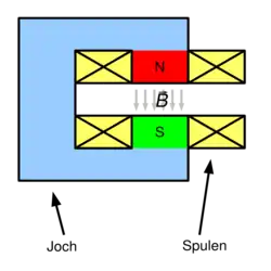 Die für den Ablenkwinkel und damit den Bahnradius geladener Teilchenstrahlen entscheidende magnetische Flussdichte im Luftspalt ergibt sich bei konstantem Querschnitt des magnetischen Weges (Joch + Luftspalt) annähernd zu: