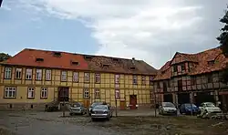 Ältestes Gebäude des sehr großen Hofs ist ein ursprünglich als Wohnhaus errichtetes Gebäude an der Nordwestecke des Grundstücks. Das Fachwerkhaus entstand in der zweiten Hälfte des 17. Jahrhunderts. Die Fassade ist mit Pyramidenbalkenköpfen verziert, die Gefache mit Zierausmauerungen versehen.