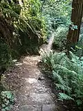 | Steep Ravine | Nach 5,68 Meilen erreichen die Läufer die Streckenabschnitt „Steep Ravine“ (Bild). Dieser Abschnitt führt steil abwärts über Gestein, Baumwurzeln und Treppen. Besonders geschickte Läufer nehmen dabei vier Treppenstufen in einem Schritt. Andere Rennteilnehmer steigen den steilen Pfad langsam und vorsichtig herab. Dies hat in vergangenen Jahren zu äußerst gefährlichen Rennsituationen und zahlreichen Stürzen geführt. Damit gehört Steep Ravine zu den gefährlichsten Streckenabschnitten im Dipsea Race. | 5,68 |