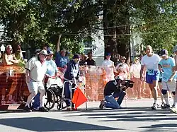 Eine Läuferin wartet kurz vor der Ziellinie auf ihren Mann, der ebenfalls am Rennen teilnimmt -