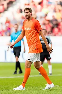 Dirk Werner Nowitzki (* 19. Juni 1978 in Würzburg) ist ein ehemaliger deutscher Basketballspieler. Er spielte von 1998 bis 2019 in der nordamerikanischen Profiliga NBA für die Dallas Mavericks. In der NBA-Saison 2006/07 bekam Nowitzki als erster Europäer den NBA Most Valuable Player Award (MVP) für den wertvollsten Spieler der Hauptrunde verliehen.[2] In den NBA Finals 2011 gewann er mit den Dallas Mavericks als erster Deutscher die NBA-Meisterschaft und wurde zudem mit dem NBA Finals MVP Award für den wertvollsten Spieler der Finalserie ausgezeichnet.[3] Insgesamt 14 Mal wurde Nowitzki für das NBA All-Star Game nominiert.
