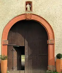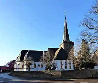 Die 1357 erstmals erwähnte Kirche[45] liegt leicht erhöht und wird durch die Kirchhofsmauer von der vorbeiführenden Landstraße abgetrennt.