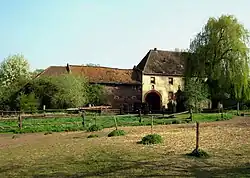An der Dirmerzheimer Burg, heute nach einem ehemaligen Pächter Tilmannshof genannt, wurden in einem Trakt der Wirtschaftsgebäude Wohnungen eingerichtet. Sie grenzen an das barocke ehemalige Herrenhaus, dessen kreuzgratgewölbter Keller zu einer früheren Burganlage gehörte.[57] Die Reste des Wassergrabens, die bis vor einigen Jahrzehnten noch den rückwärtigen Teil der Hofanlage umschlossen, sind verschwunden.