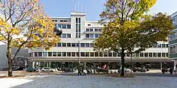 Inzwischen hatten im Juli 1928 die Architekten Bruno Paul und Franz Weber einen noch von der „Disch Hotel- und Verkehrs-AG“ ausgeschriebenen Wettbewerb zum Bau eines monumentalen städtischen Verwaltungsgebäudes gewonnen.[1] Die Ausführung des Eckgebäudes im Stil der Neuen Sachlichkeit erfolgte als Rundbau, der eine Querbänderung der Fensterzonen vorsah und ein markantes Treppenhaus beinhaltete. Durch die Fensterbänder ergibt sich eine horizontal gegliederte Rundbogenfassade, während das Erdgeschoss vollständig in Schaufenster aufgelöst ist.[2] Es gilt als wichtigstes Zeugnis der Neuen Sachlichkeit in der Domstadt und als eines der Hauptwerke des Architekten Bruno Paul. Das Gebäude war auch eines der ersten Bauwerke, bei dem in großem Umfang dünne Natursteinplatten vorgehängt wurden.[3] Die Einweihung erfolgte am 1. Februar 1930.[4] Das oberste Geschoss fiel im Zweiten Weltkrieg einem Luftangriff zum Opfer, so dass heute nur noch 5 Etagen vorhanden sind. Das Bauwerk steht seit 15. Oktober 1981 mit der Denkmalnummer 787 unter Denkmalschutz.[5]