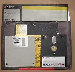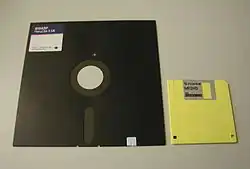 - 3½″ bzw. 3,5″ (eigentlich 90 mm) mit 360 bis 2880 KiB (1440 KiB HD-Disketten waren zuletzt das Standardformat im PC-Bereich; ED-Disketten mit 2880 KiB fanden kaum Verbreitung.) Die Kunststoffhülle ist 90 mm breit, 94 mm lang und 3,3 mm hoch.