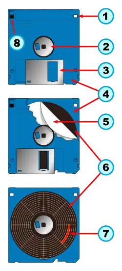 Eine Diskette ist ein magnetischer Datenträger. Sein Grundbestandteil ist eine dünne, biegsame Kunststoffscheibe aus boPET. Diese ist mit einem magnetisierbaren Material beschichtet, meist Eisenoxid, dessen Speicherprinzip dem der Festplatte ähnelt. Anfangs nur von einer quadratischen Papphülle mit Lesefenster umschlossen, sind spätere Datenträger (ab 3½″) durch ein festes Kunststoffgehäuse mit Fensterverschluss besser geschützt. Die englische Bezeichnung „floppy disk“ oder kurz Floppy, was im Deutschen etwa „wabbeliger Scheibe“ entspricht, beruht auf der flexiblen Eigenschaft des Speichermediums, im Gegensatz zur hard disk („feste Scheibe“) eines Festplattenlaufwerkes (englisch hard disk drive).