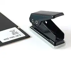 Der Diskettenlocher, der bald als Antwort auf diesen Bedarf auf den Markt gebracht wurde, verfügt über einen Anschlag, der eine korrekte Positionierung ermöglicht, und ein Schneidwerk, das stark genug ist, um die Hülle einzuschneiden, ohne dabei die Diskette zu knicken.