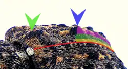 | Abb. 3: rot: Flügeldeckennaht gelb getönt: 1. Zwischenraum grün getönt: 2. Zwischenraum pink getönt: 3. Zwischenraum Pfeil grün: Subbasalhöcker Pfeil blau: Haarbüschel |
