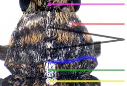 Der Halsschild ist gleich lang wie breit oder knapp so breit wie lang. Die Seiten sind leicht gerundet und verengen sich nach vorn auf Kopfbreite. Deutlich vor dem Hinterrand des Halsschilds abgesetzt verläuft eine Querleiste, die zu den Seiten des Halsschilds etwas nach vorn abbiegt, danach wieder nach hinten umgebogen ist und auf die Hinterecken des Halsschilds zu läuft (in Abb. 2 rechte Hälfte blau nachgezogen). Zwischen dieser Querleiste und dem Schildchen (in Abb. 2 gelb markiert) liegt ein schmaler grauweißer Längsfleck (in Abb. 2 grün markiert). Dieser setzt sich nach vorn als unscheinbares Längsband fort (in Abb. 2 schwarz markiert), das sich im Normalfall über den gesamten Halsschild erstreckt, kann aber auch unterbrochen sein oder ganz fehlen. In Höhe der Augen befindet sich nahe der Halsschildbasis beiderseits eine helle Sublateralmakel (in Abb. 2 pink markiert).