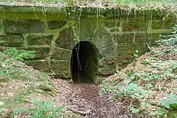 Aufgrund der tiefliegenden Talsohle konnte das Wasser des Tiefenbachs nicht in den Kanal abgeleitet werden. Zur Durchleitung wurde an der Talsohle ein großzügig dimensionierter Durchlass gebaut. Der Bachlauf wird dabei in Süd-Nord-Richtung auf einer Länge von etwa 180 Metern durch den Dammsockel geleitet. Der U-förmige Tunneldurchmesser misst im Schnitt etwa 2,30 mal 2 Meter. Die Portale sind aus Burgsandstein gebaut. Der Innenbereich ist vollständig und überwiegend mit Burgsandsteinquadern ausgekleidet. Rechtsseitig parallel zum Bach verläuft ein etwa einen Meter breiter Gehweg der für Revisionsarbeiten angelegt wurde. Im Inneren findet sich eine Einmeiselung mit der Jahreszahl 1877. Diese scheint aber neueren Datums zu sein und wurde wahrscheinlich bei der Restaurierung in den 1990ern erneuert. An der Decke und Wänden finden sich teilweise schöne und bunte Sinter- und Tropfsteinbildungen. Die rötlichen und bräunlichen Farbschläge verdanken sie den gelösten Eisenoxiden aus dem umgebenden Dogger.
