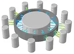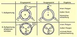 Eine Reduzierung der Wandstärkevariationen erfolgt durch Zerspanen (Drehprozess, Bild 4). Während der Bearbeitung bewirkt die Spannkraft Fsp eine elastische Verformung des Werkstücks. Die dadurch bedingte inhomogene Spanabnahme führt normalerweise zu Wandstärkeschwankungen und Rundheitsabweichungen. Indem der Ring bei der zweiten Aufspannung jedoch um 60° gedreht wird und die Spannkraft entsprechend der verringerten Wandstärke (im Vergleich zu der ersten Aufspannung) angepasst wird, werden Wandstärkeschwankungen bereits größtenteils kompensiert.