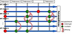 Jeder Teilprozess der Prozesskette kann den Zustand dieser VP-Träger entweder direkt über die Prozessgrößen oder indirekt durch Wechselwirkungen zwischen einzelnen VP-Trägern ändern. Bild 2 zeigt schematisch die Beeinflussung der VP-Träger in einer Prozesskette.