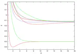 Für große Kern-Kern-Abstände haben die (totalen) Energie-Eigenwerte für diese beiden niedrigsten Zustände dieselbe asymptotische Entwicklung in reziproken Potenzen des Kern-Kern-Abstandes R:[10][11]
