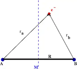 Die einfachste elektronische Schrödinger-Gleichung für das Wasserstoff-Molekülion berücksichtigt neben dem einen Elektron die beiden Kerne, gekennzeichnet mit A und B, an festen Positionen im Raum. Sie kann geschrieben werden als
