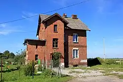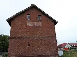 Alter Bahnhof in NautzkenRückseite des Bahnhofsgebäudes: die alte deutsche Ortsbezeichnung "Nautzken" ist immer noch erkennbar.