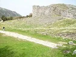 Der Akropolisbezirk war von einer Mauer umgeben, die heute noch zum Teil bis in drei Meter Höhe erhalten ist. Die Mauer hat etwa eine Länge von 750 Metern und eine Breite von 3,60 Metern. Zu ihr gehörten drei Tore und elf Türme. Die Akropolis umfasst etwa 3,5 Hektar. Sie wurde zweischalig aus großen Kalksteinquadern errichtet, der Innenraum mit Bruchsteinen verfüllt. Die Mauer entstand entweder während der ersten Bauphase der Peribolosmauer oder schon etwas früher.