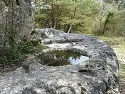 Er besteht aus zwei Elementen. Das untere ist ein Aufschluss mit einer einseitigen Erhöhung, in dessen senkrechten Kalkstein irgendwann eine Scheintür gehauen wurde. Die Erhöhung hat etwa die Form eines Kegelstumpfes mit einer Grundfläche von 19 m² und einer durchschnittlichen Höhe von 1,75 m. Auf der Oberfläche des Felsaufschlusses ist seitlich ein 0,25 m tiefes Becken (ähnliche einem Bullaun) von 0,8 m Durchmesser eingepickt worden. Regenwasser wird auf der Oberfläche gesammelt und in einem Kanal der Eintiefung zugeführt. Um dem Denkmal einen Dolmencharakter zu verleihen, ist ein zweiter Stein erforderlich, der am Rand über der Nordseite liegt. Er ist etwa dreieckig, misst 3,5 × 1,9 m, ist 1,25 m hoch und nimmt etwa die Hälfte der Grundfläche seines Basissteins ein. In der Nähe gibt es im Boden ein weiteres künstliches Becken, das aber jünger und tiefer als das andere ist.