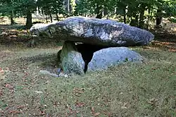 Der niedrige einfache Dolmen (französisch Dolmen simple) liegt in den Resten eines Rundhügels von etwa 10,0 m Durchmesser. Er besteht aus drei Tragsteinen und der allseits überstehenden Deckenplatte. Die Kammer misst etwa 2,0 × 1,5 m.