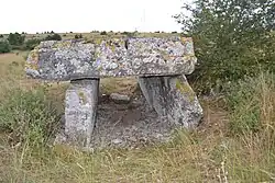 Der einfache Dolmen (französisch Dolmen simple) besteht aus einem massiven Deckstein, der einschließlich eines abgebrochenen Teils 4,35 m lang und fast 4 m breit ist und dessen Gewicht auf etwa 26,5 Tonnen geschätzt wird. Er ist vorne und hinten offen und liegt auf zwei seitlichen Tragsteinen von 4,50 m Länge und 1,70 m Höhe.[1] Der Resthügel ist nur zu erahnen.