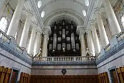 Die heutige Orgel an der Rückwand des Chores wurde in den Jahren 1911 bis 1913 von den Orgelbauern Wilhelm Schwarz & Sohn (Überlingen) errichtet.[17] Das Orgelgehäuse im Stil der früheren Silbermann-Orgel ist 12 m hoch, 7 m breit und 4 m tief, und bildet mit seinem dunklen Naturholz einen farblichen Kontrast zum weißen Innenraum der Kirche. Bei der Renovierung der Rotunde in den Jahren 1981/1983 lehnte die staatliche Hochbauverwaltung (damals hauptsächlicher Kostenträger) eine größere Instandsetzung der Orgel mit geforderter klanglicher „Barockisierung“ ab. Das Instrument wurde 1983 lediglich gereinigt und instand gesetzt. Im Laufe der Jahre litten die ursprünglichen Lederbälge jedoch zunehmend an Zersetzung. 1997 ergab sich die finanziell günstige Gelegenheit einer großen Orgelsanierung. Die „Barockisierung“ war nicht mehr aktuell und es galt nun vielmehr, die Orgel in ihrer Originalität einschließlich der „romantischen“ Intonation zu bewahren. Die staatliche Hochbauverwaltung beauftragte den Orgelbauer Johannes Klais (Bonn). Zudem fand ein neuer Spieltisch eine bessere Zuordnung.[18] Die Orgel hat heute 54 Register auf drei Manualen und Pedal.[19][20]