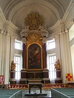 Sehenswert ist der barocke Hochaltar, der 1712 nach Plänen Nicodemus Tessins d. J., die dieser 1704 entworfen hatte, geschaffen wurde. Dieser vollendete damit das Werk seines Vaters. In der Korona ist eine den Heiligen Geist symbolisierende Taube zu sehen. Unter dieser ist eine Szene der Schöpfungsgeschichte dargestellt: Gott trennt das Dunkel vom Licht.